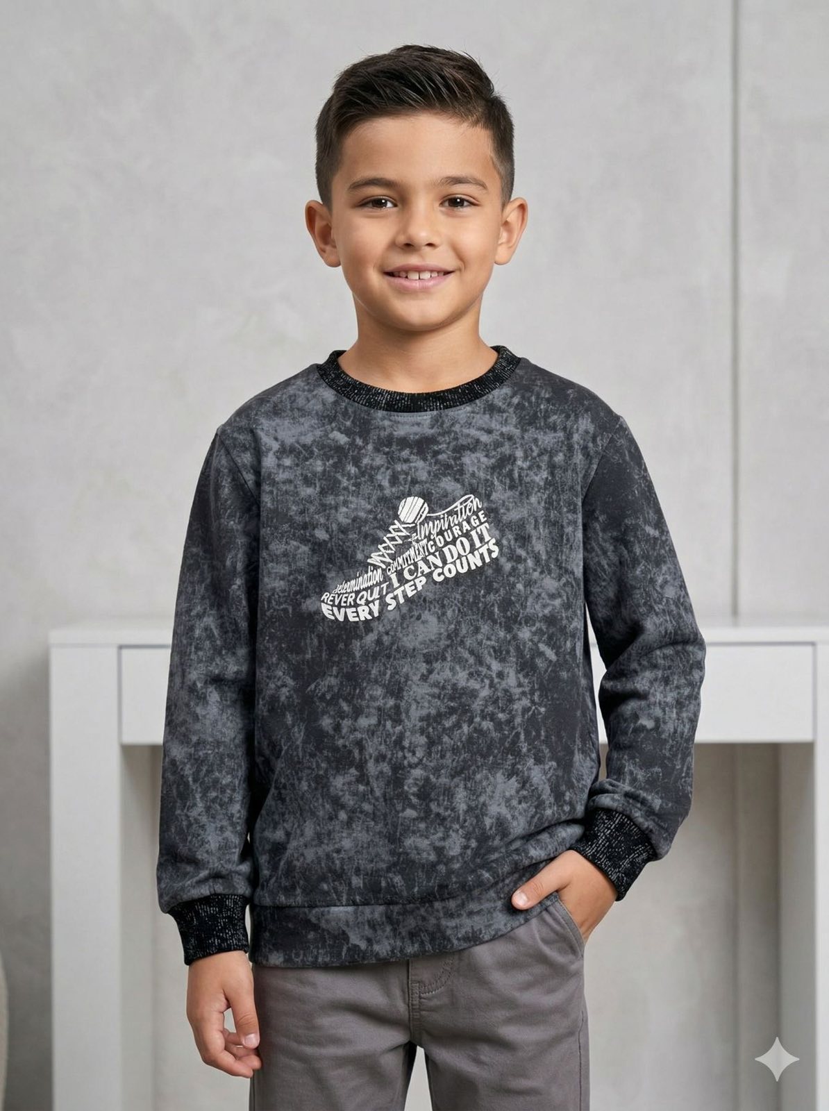 Джемпер «Варка» графіт🧵 2.нитка/петля -преміальна, бавовняна, мʼяка, дуже приємна, крутезна тканина✅ трендовий -ефект варки, декоровано стильовим принтом, класичний крій, горловина та манжети з рубчика👍📏 116, 122, 128, 134