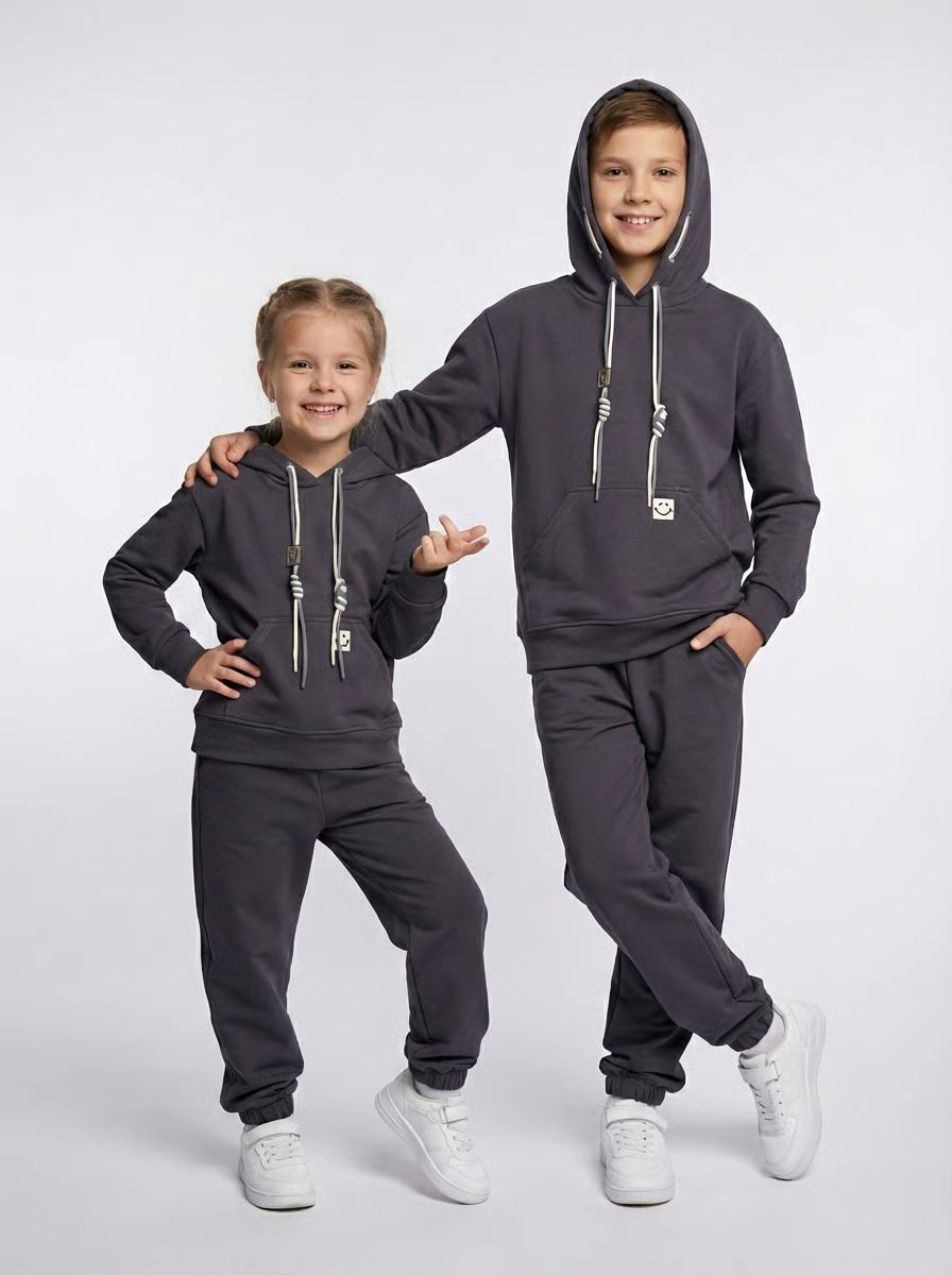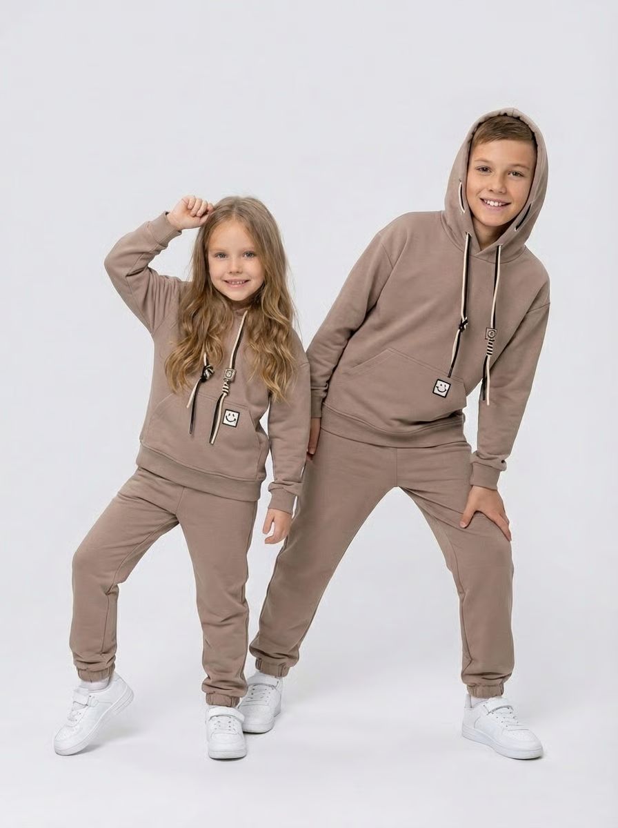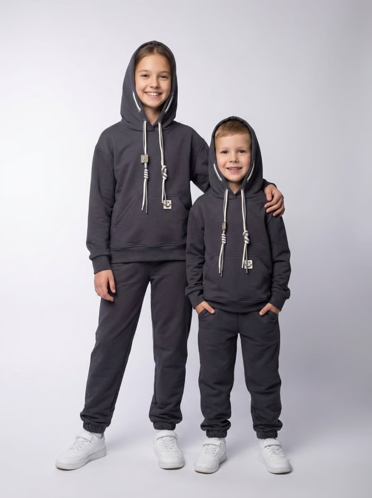 Костюм “Uni” Розміри з 92 до 110 Тканина: велюр •якісний, турецький велюр; •кофта на блискавці з карманами; •капюшоном з люверсами та стильним, подвійним шнурком; •штани з карманами; •дуже гарний колір і моделька унісекс, підійде для хлопчиків і дівчаток; •повномірні розміри; Розміри: 92,98,104,110