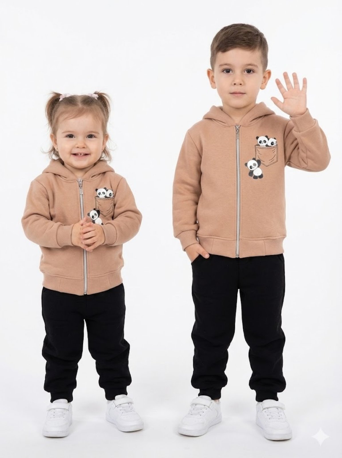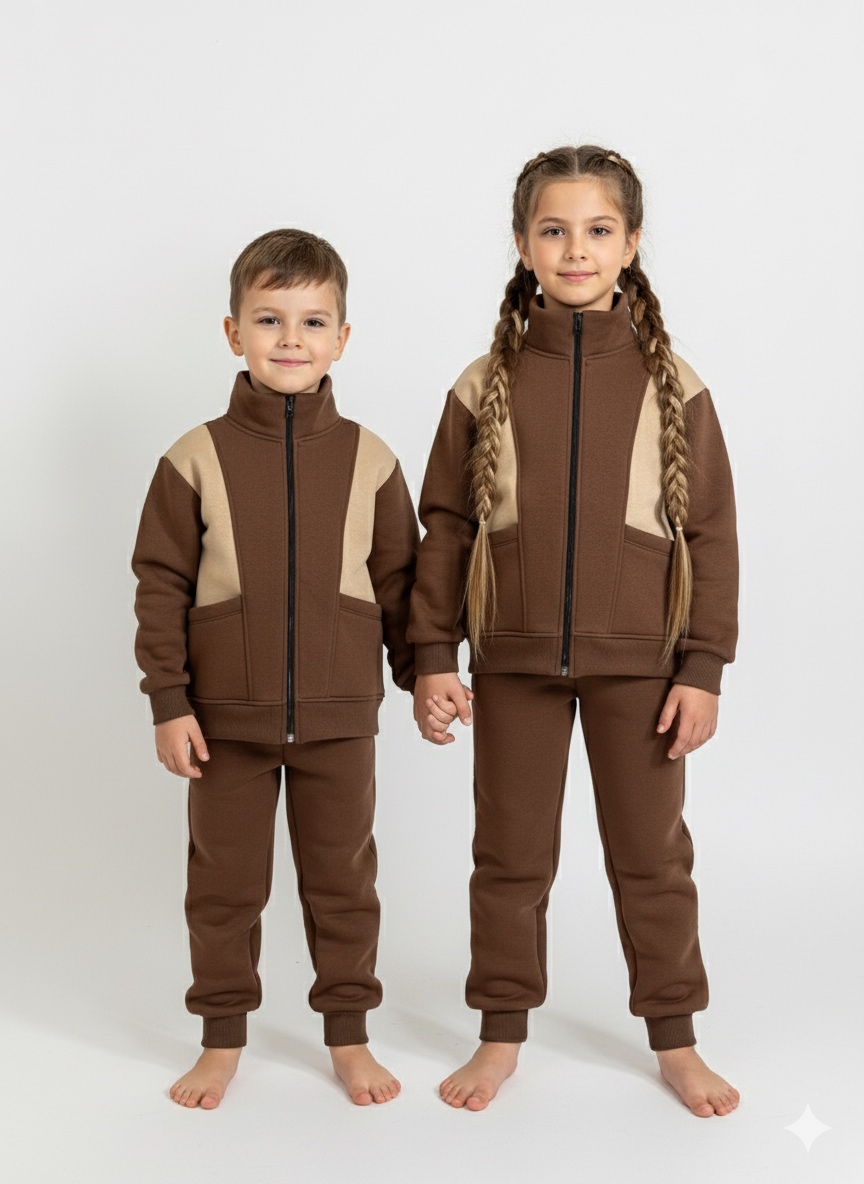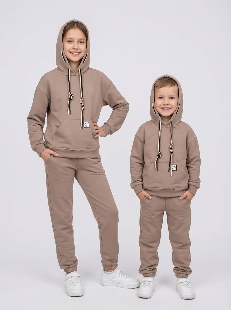Костюм “Uni” Розміри з 92 до 110 Тканина: велюр •якісний, турецький велюр; •кофта на блискавці з карманами; •капюшоном з люверсами та стильним, подвійним шнурком; •штани з карманами; •дуже гарний колір і моделька унісекс, підійде для хлопчиків і дівчаток; •повномірні розміри; Розміри: 92,98,104,110