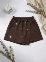 Спідниця-шорти “Стрази” шоколад 2.нитка/пеньє -люксова, турецька тканина з фабричним нанесенням стразів ✅ стильна моделька, з широким поясом, з карманами, зручна посадка та довжина, ідеально стилізуються в костюми з нашими джемперами 116,122,128,134